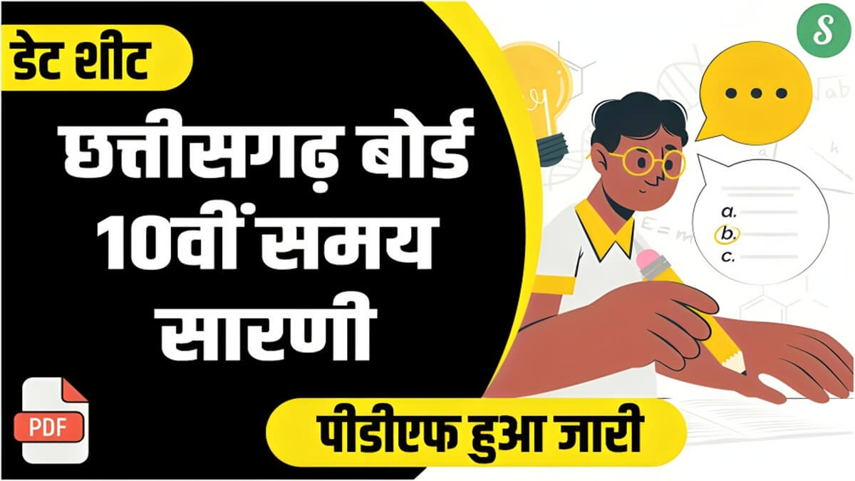 CG Board 10th Time Table 2026 माध्यमिक शिक्षा मंडल रायपुर छत्तीसगढ़ द्वारा ऑफिशल वेबसाइट पर सीजीबीएसई कक्षा 10वीं परीक्षा समय सारणी आधिकारिक तौर पर जारी कर दिया है। आपको बता दें कि छत्तीसगढ़ बोर्ड द्वारा प्रतिवर्ष के भांति इस वर्ष भी छत्तीसगढ़ बोर्ड कक्षा 10वीं परीक्षा 2026 की आयोजन करने के लिए छत्तीसगढ़ बोर्ड 10वीं परीक्षा समय सारणी जारी कर दिया है। जिसे सभी परीक्षार्थी बोर्ड की ऑफिशल वेबसाइट पर या नीचे दिए गए लिंक पर डेट शीट पीडीएफ डाउनलोड कर सकते हैं।